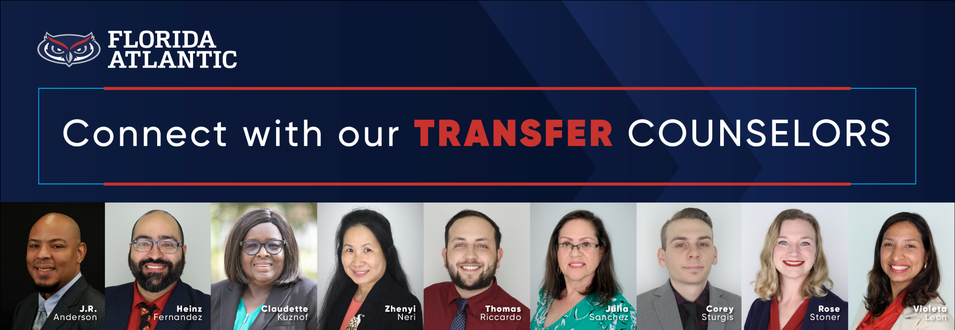![]() Transfer Admissions AppointmentsThank you for your interest in Florida Atlantic University.You can schedule an appointment with a Transfer Admissions Counselor and a counselor will call you to discuss all your transfer questions. Please note that this appointment is not academic advising; to schedule a meeting with your academic advisor, please visit your Owldone portal. If appointments are fully booked, then email admissions@fau.edu or consider attending a virtual Transfer Tuesday session. | |